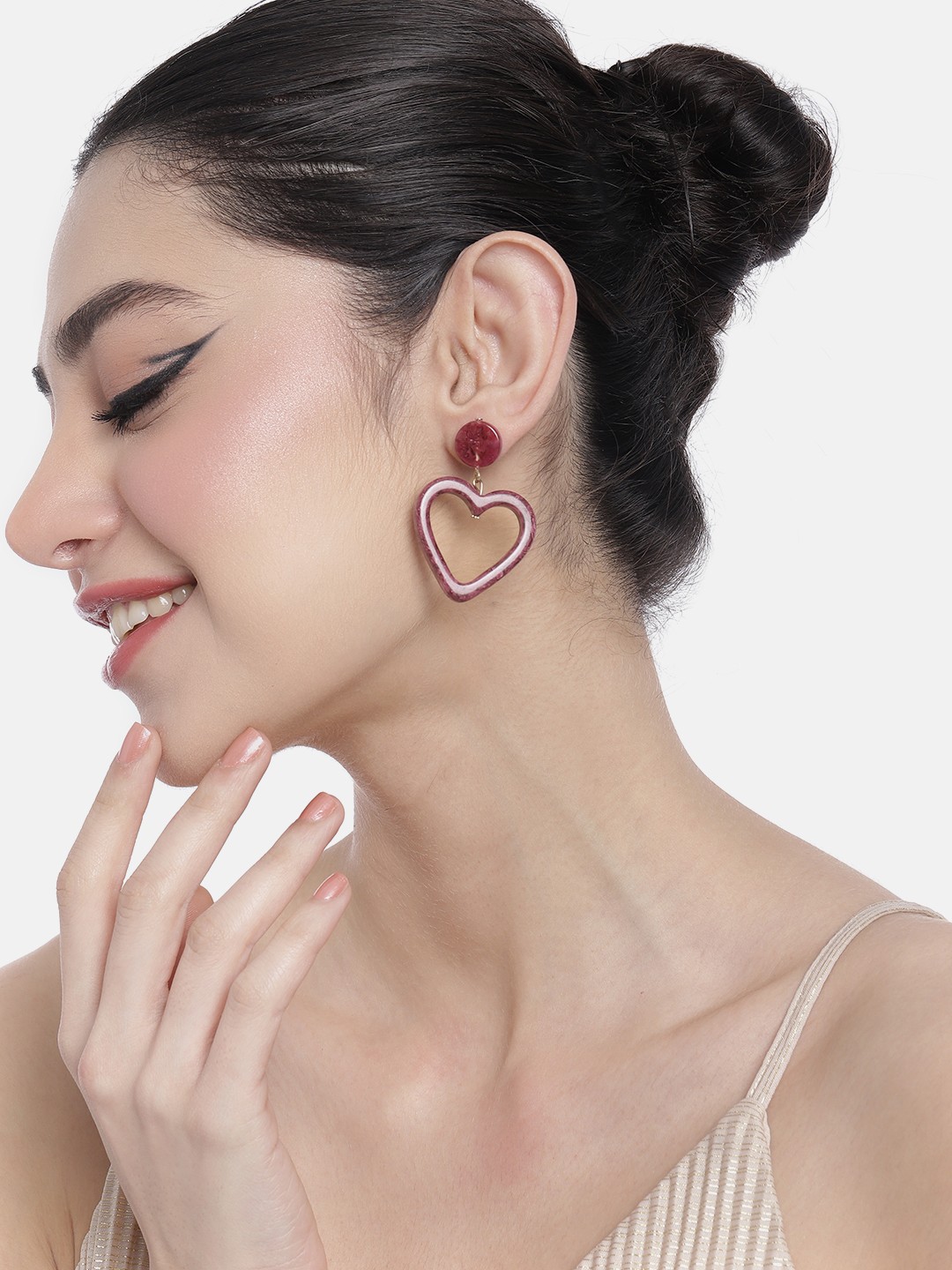 A pair of fuchsia pink heart shaped drop earrings, has artificial stones