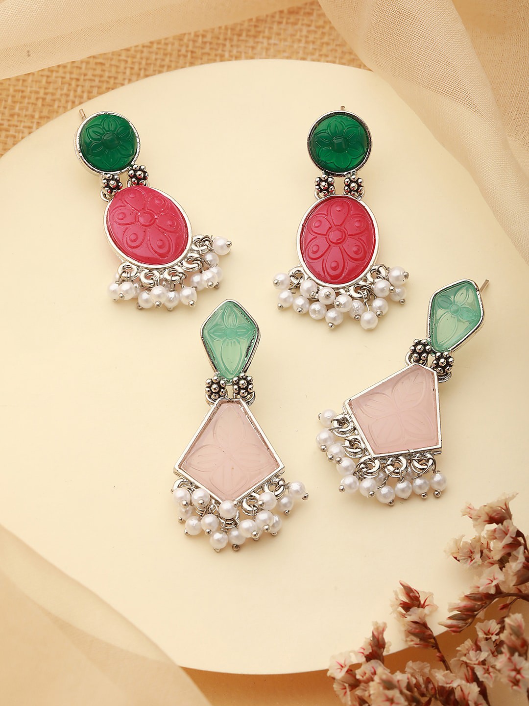 Set of 2 Red, green contemporary drop earrings, silver-plated, has artificial stone